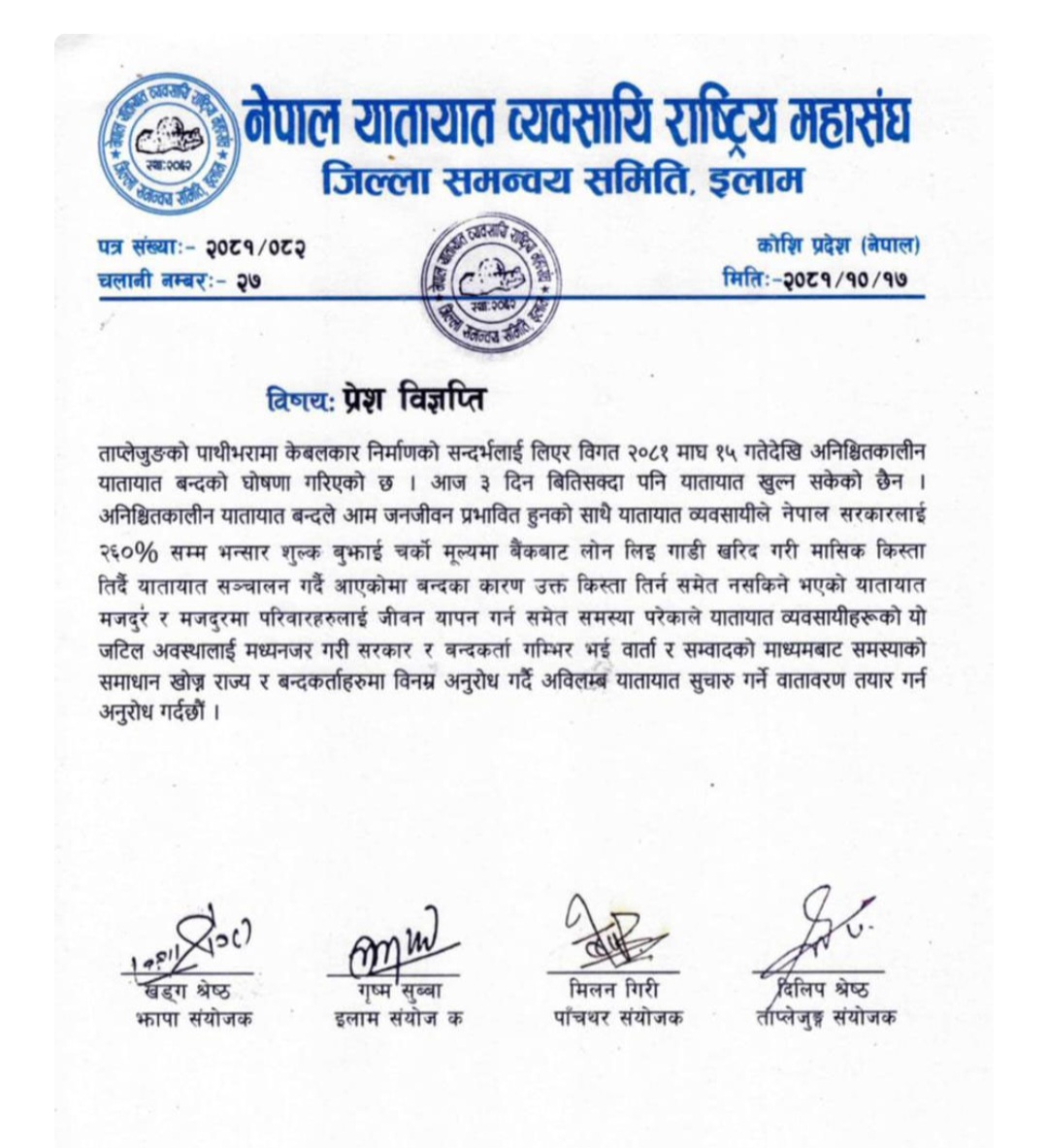 नेपाल यातायात व्यवसायी राष्ट्रिय महासंघ, जिल्ला समन्वय समिति इलामले बिहीबार विज्ञप्ति जारी गरी तीन दिनसम्म पनि यातायात खुल्न नसक्दा व्यवसायीलाई अतिरिक्त भार परिरहेको जनाएको छ ।
