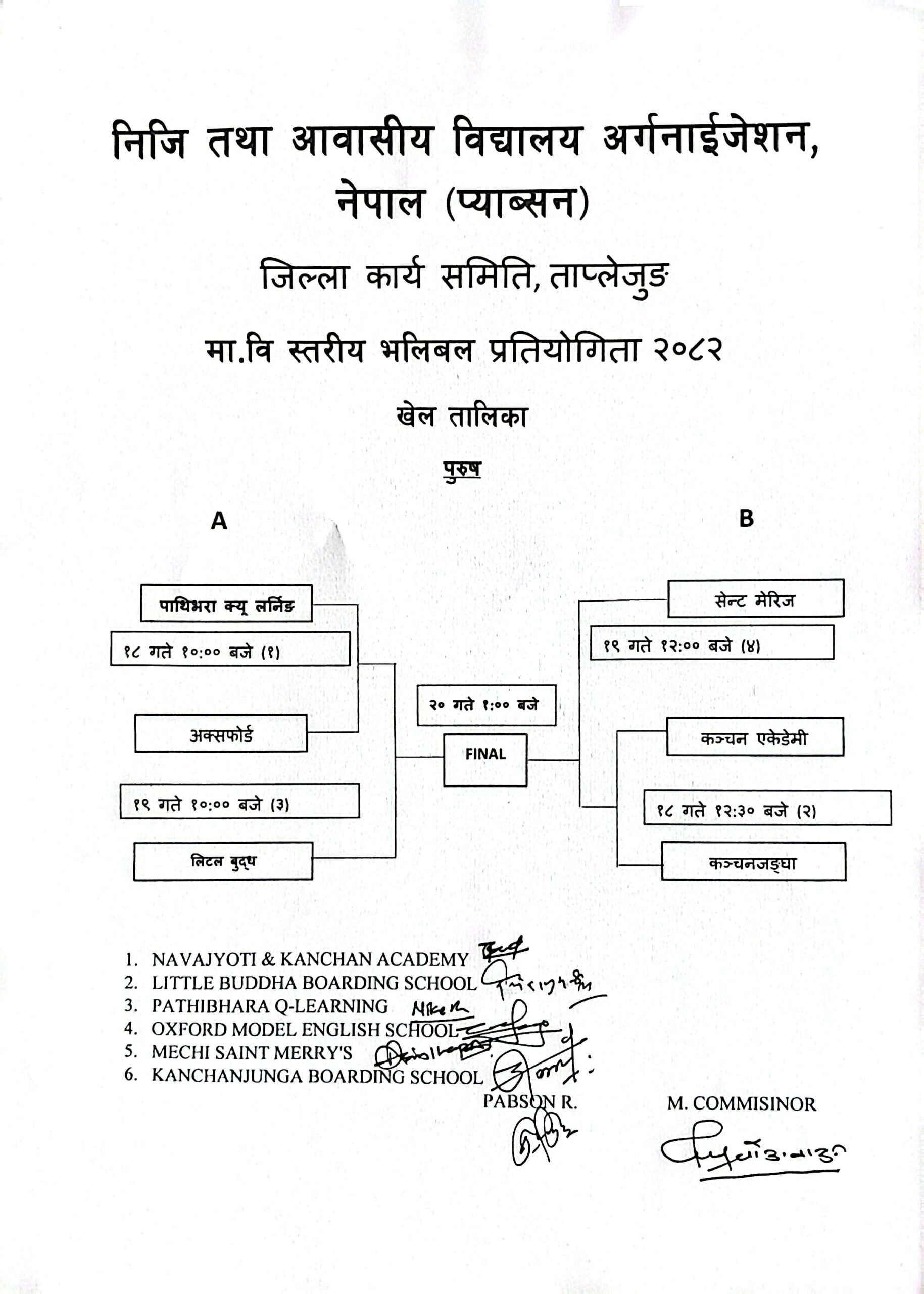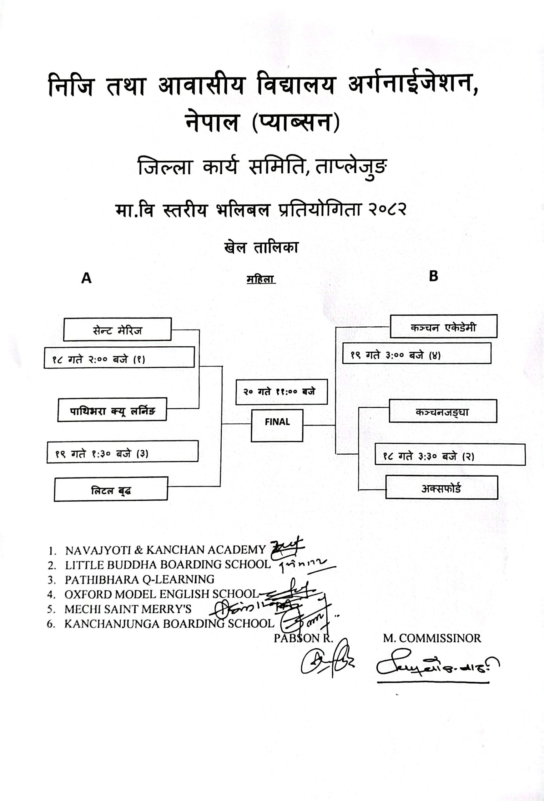 प्रतियोगिताको फाइनल खेल मंसिर २० गते दिउँसो १:०० बजे कन्चन नवज्योति स्कुलको कोर्टमा खेलाइनेछ।