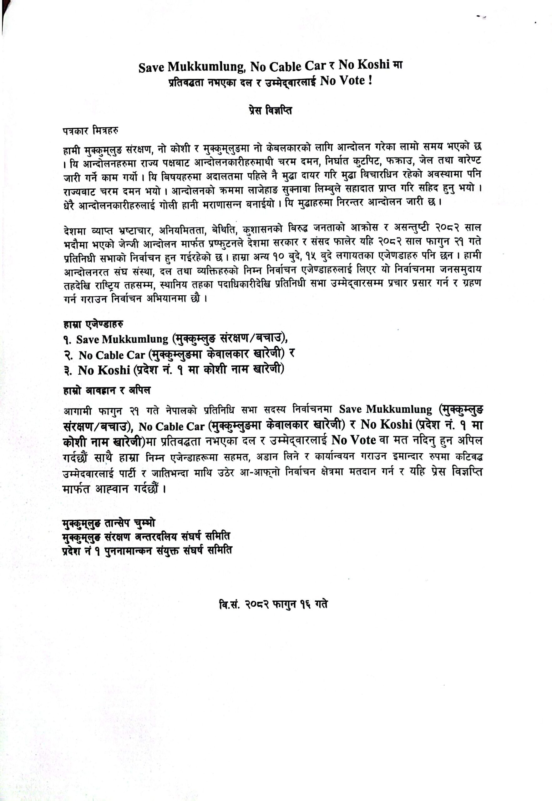 विज्ञप्तिमा देशमा व्याप्त भ्रष्टाचार, अनियमितता र कुशासनविरुद्ध जनआन्दोलनबाट स्थापित संघीय लोकतान्त्रिक गणतन्त्रको मर्मअनुसार जनप्रतिनिधिहरूले जनभावनाको सम्मान गर्नुपर्ने उल्लेख गरिएको छ। समितिहरूले आफ्ना तीन मुख्य एजेन्डा—‘Save Mukkumlung’ (मुक्कुम्लुङ संरक्षण/बचाउ), ‘No Cable Car’ (मुक्कुम्लुङमा केबलकार खारेजी) र ‘No Koshi’ (प्रदेश नं. १ मा ‘कोशी’ नाम खारेजी)—मा स्पष्ट प्रतिबद्धता जनाउने उम्मेदवारलाई मात्र समर्थन गर्ने जनाएका छन्।