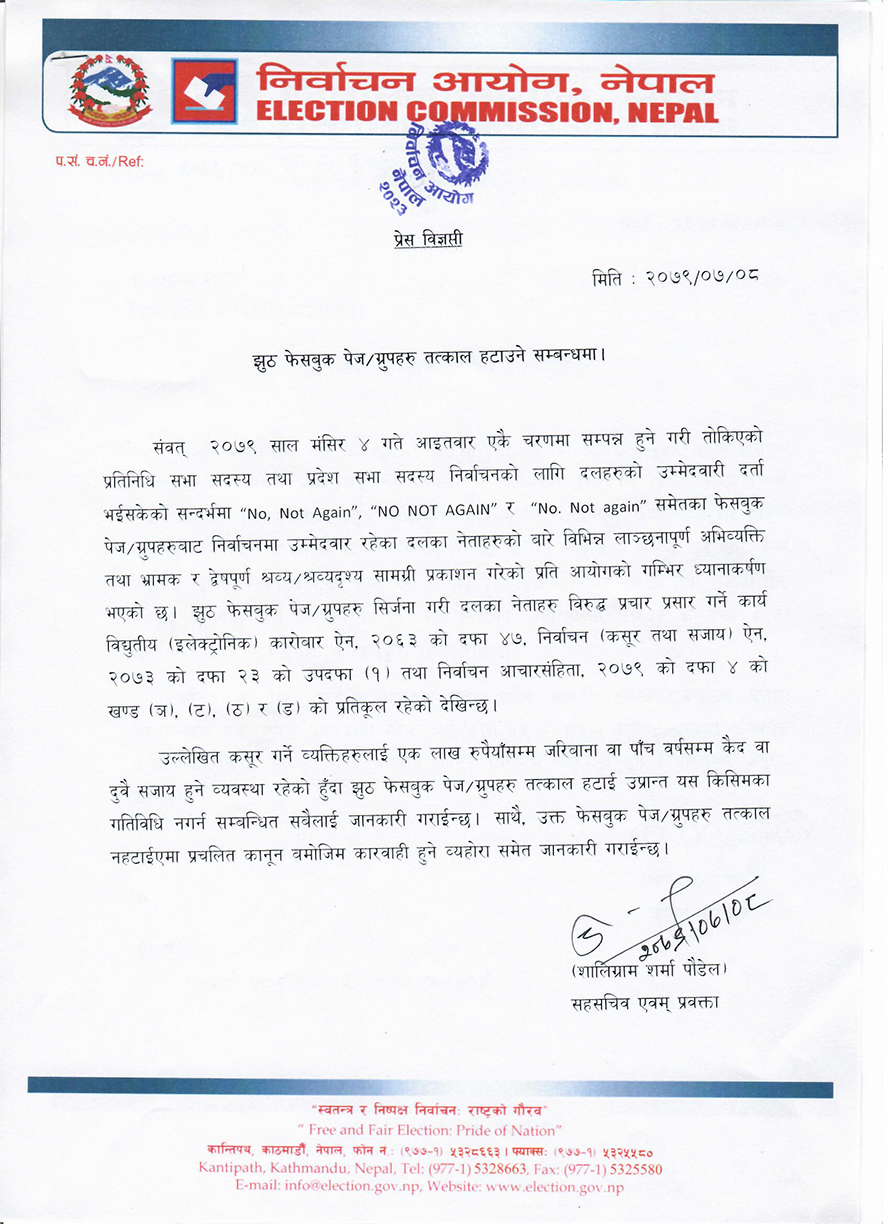 ‘नो नट अगेन’ आदि नाममा बनेका फेसबुक ग्रपमा शीर्ष नेतामाथि लाञ्छना गरिएको भन्दै आयोगले यस्ता पेज र ग्रुप तत्काल हटाउन आग्रह गरेको हो ।