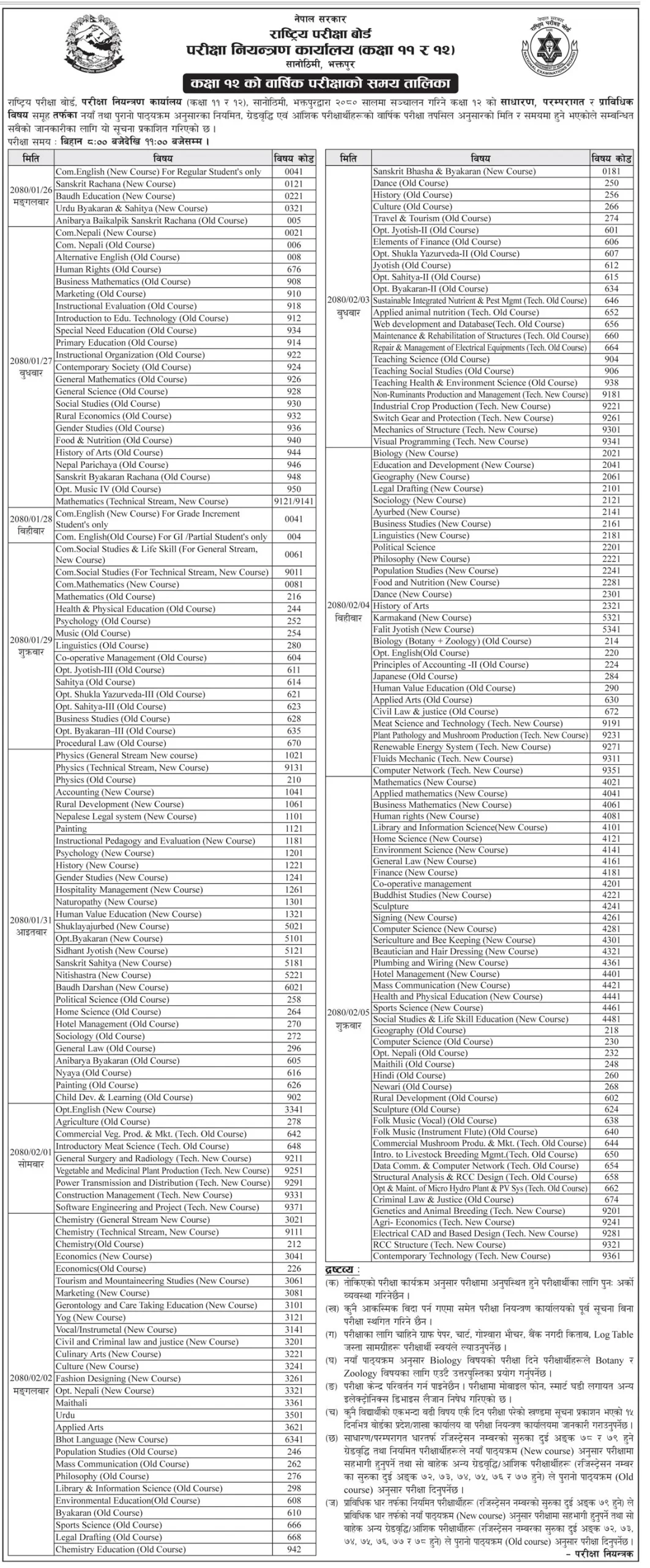 परीक्षा नियन्त्रण कार्यालय (कक्षा ११ र १२) कक्षा १२ को वार्षिक परीक्षाको समय तालिका सार्वजनिक गरेको छ । बोर्डले कक्षा १२ को साधारण, परम्परागत र प्राविधिक विषय समूह तर्फका नयाँ तथा पुराना पाठ्यक्रम अनुसार नियमित, ग्रेडबृद्धि एवं आंशिक परीक्षाको तालिका सार्वजनिक गरेको हो ।