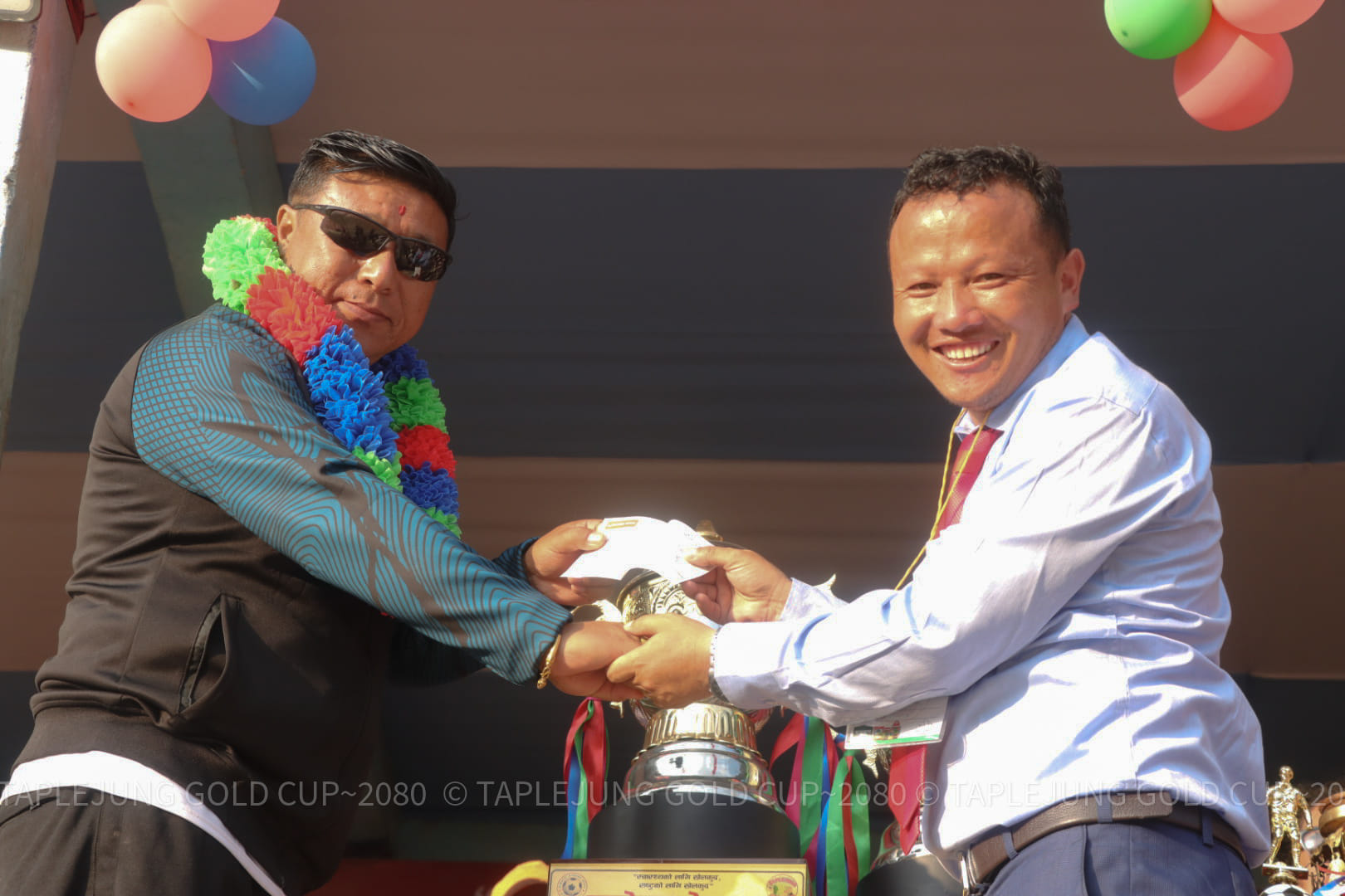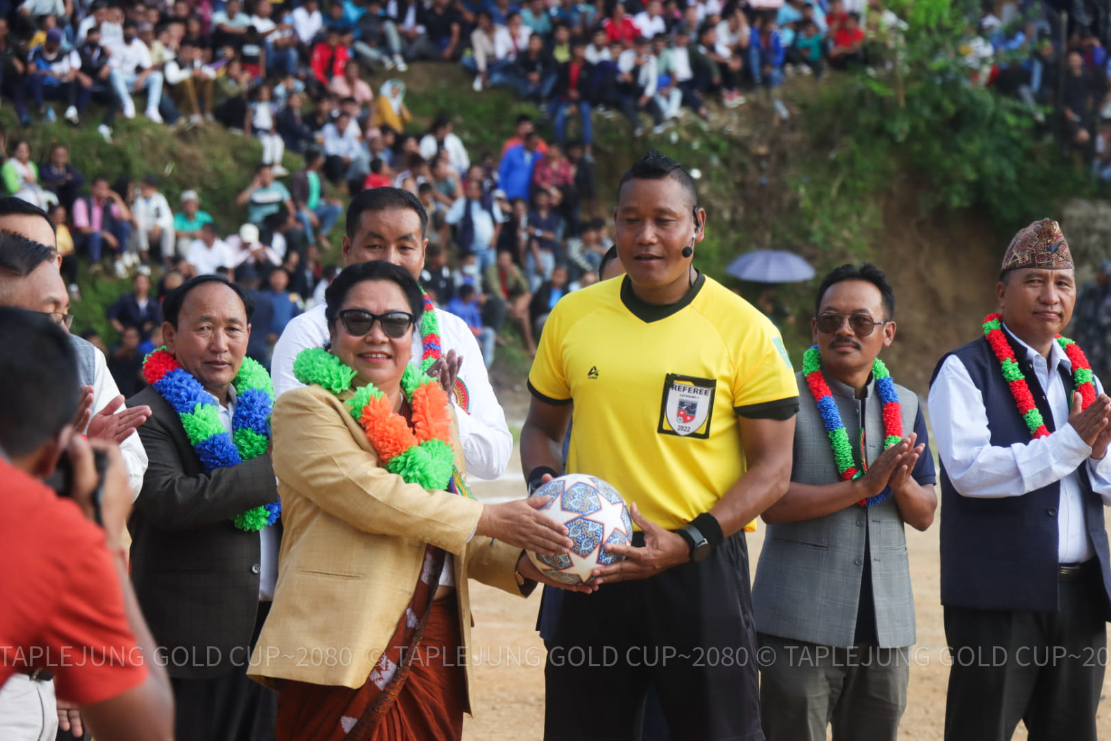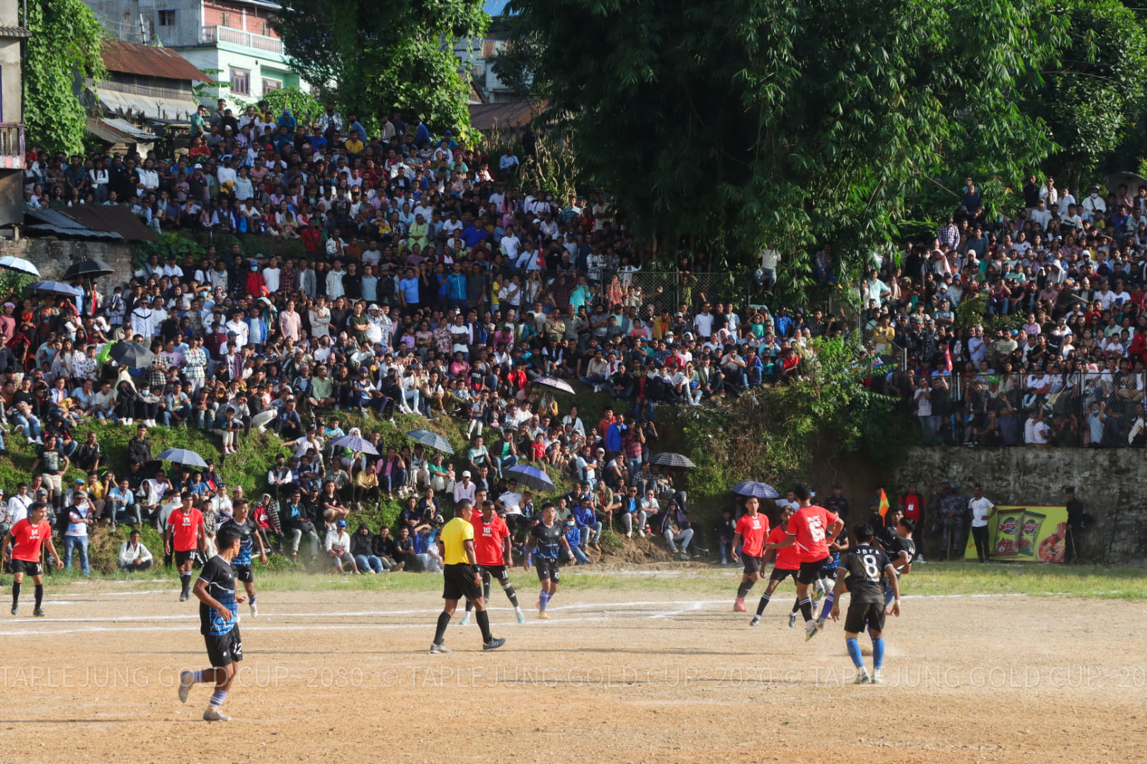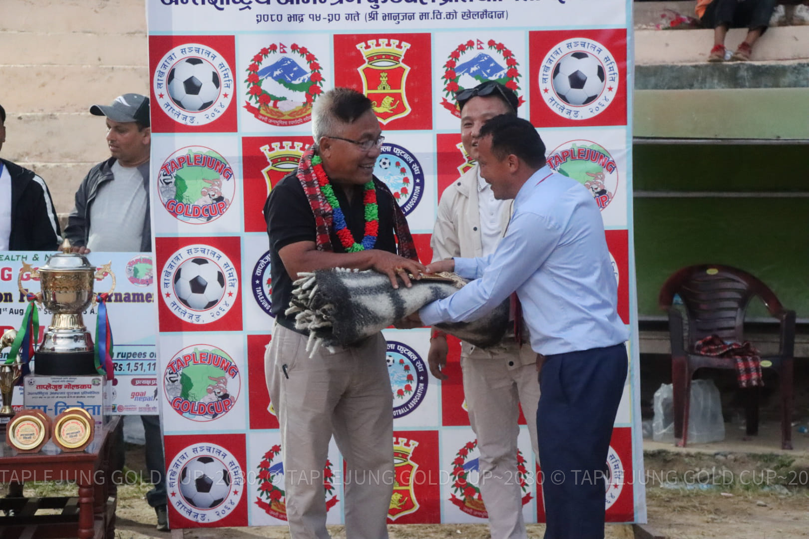 यता आर्थिक सहयोग जुटाउन भदौ ६ गते खोलिएको लक्ष्मी सनराईज बैंकस्थित खातामा न्यून रकम जम्मा भएको थियो । भदौ १० गतेसम्म हरेकको अनुहार मलिन थियो । तैपनी समितिका हरेकले भनिरहेका थिए,–फुटबल हुन्छ । अपवाद स्वरुप केहीले भन्थे,‘फुटबल त हिलोमा गर्ने नै भए । जिल्लाकै वेइज्जत हुने भयो ।’ तर नेतृत्व र समितिप्रति सिंगो समाज सकारात्मक थियो । नगद सहयोग गर्नेको विवरण क्षण–क्षणमा ताप्लेजुङ गोल्डकप पेजमा आउँथ्यो । बैङमा पैसा जम्मा नभएपनि खोजी–खोजी गएर आयोजकलाई नगद नै बुझाएको फोटोले आर्थिक समस्या छैन भन्ने झल्को दिन्थ्यो । फुङलिङ नगरपालिका नगरप्रमूख अमिर मादेनले ५ लाख रुपैयाँ कार्यपालिका बैठकबाट निर्णय गराएर दिने बचनले समितिलाई ठूलो ढाडस मिल्यो । आठराई त्रिवेणी गाउँपालिका अध्यक्ष दीपेन पोमू र मैवाखोला गाउँपालिका अध्यक्ष विजयप्रकाश वनेमले सामाजिक संञ्जालमै बधाई दिएर खेल आयोजना गर्न प्रेरित गर्यो । फुटबललाई नजिकबाट नियालेका एमालेका उपसचिव मणि पोमूदेखि प्रदेश सांसद खगेनसिंह हाङगाम, अग्रज खेलाडीहरु अम्बर श्रेष्ठ,अनन्त भट्टराई,यादब श्रेष्ठ र भलिबल पिता तेजप्रता सुब्बा र कृष्ण चोङवाङले समेत समितिलाई विश्वास गर्यो । असल नियतले सुरुवात भएको कामको अन्त्य पनि असल परिणामसहित हुन्छ भन्ने भावना बोकेकाको मनोबल बढ्नेगरि भदौ ११ गतेदेखि मौसमले पनि साथ दियो । अझ भनौ,प्रकती अनुकुल बन्न थाल्यो । भदौ ११,१२ र १३ गतेको दिनलाई आयोजकले साँच्चिकै खेल गर्न लायक मैदान बनाएरै छाडे । अध्यक्ष गुरुङले भने,‘हामीले भोक भनेनौ । न त झरि नै भन्यौ । न त निन्द्रा नै । न त तनाव । एकहोरो फुटबल मात्र भन्यौ ।’ कतिपयले त मैदानको दृश्यलाई टिक टकमा समावेश गरे । भदौ १३ गते मैदानमै पत्रकार सम्मेलन गरे । पत्रकार सम्मेलनमा गुरुङले भने,‘यो ताप्लेजुङ हो । यहाँ एकता छ । फुटबल क्रेज छ । फुटबल गर्ने तागत छ ।’ उनले भनेझै त्यो लोभलाग्दो एकता देखियो । त्यति मात्र कहाँ हो र ? पत्यारिलो नेतृत्वसहितको टिम र स्प्रष्ट भिजन भए जुनसुकै काम असम्भव छैन भन्ने पुष्टि गरिदियो । पाँचथरका अफिसियल तथा खेलाडीका अनुसार यो वर्षको मैदान २०४९ सालयताकै राम्रो हो । काबेली र गुप्तेदेखि ल्याएको डस र बालुवाले बनेको मैदान साँच्चिकै खेल्न लायक बन्यो । भुँईमा लडेर कुनै पनि खेलाडीले चोट बोक्नु परेन् । कोशी प्रदेश फुटबल सँघका महासचिव भगिरथ आले (मामा) का अनुसार यस पटक आयोजकले गज्जबै गर्यो । आलेले भने,‘भदौ १० गतेसम्म सामाजिक संञ्जालमा फोटो हेरेर नर्मश नै थिए । तर ११ र १२ गतेको कामले कहिले ताप्लेजुङ पुगौ भन्ने लाग्थ्यो ।’ फुटबल बुझेको मान्छेले नेतृत्व गर्दाको नतिजा कति फरक हुन्छ भन्ने सावित गर्यो । स्टेजमा प्रतिनिधिसभा सदस्य डा.तोषीम