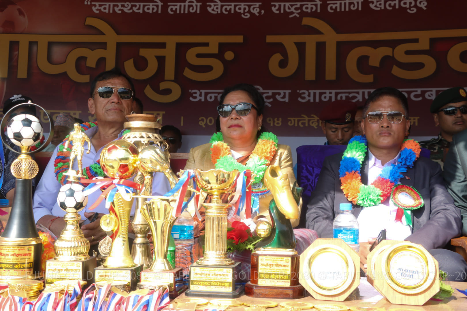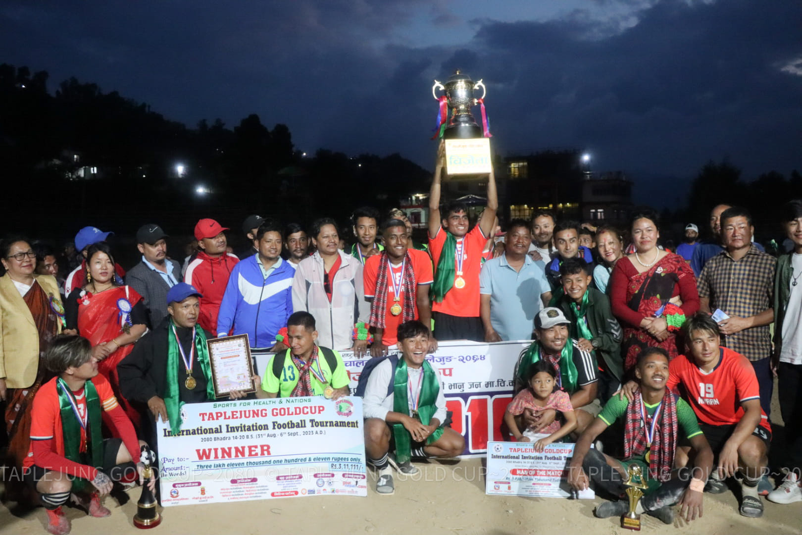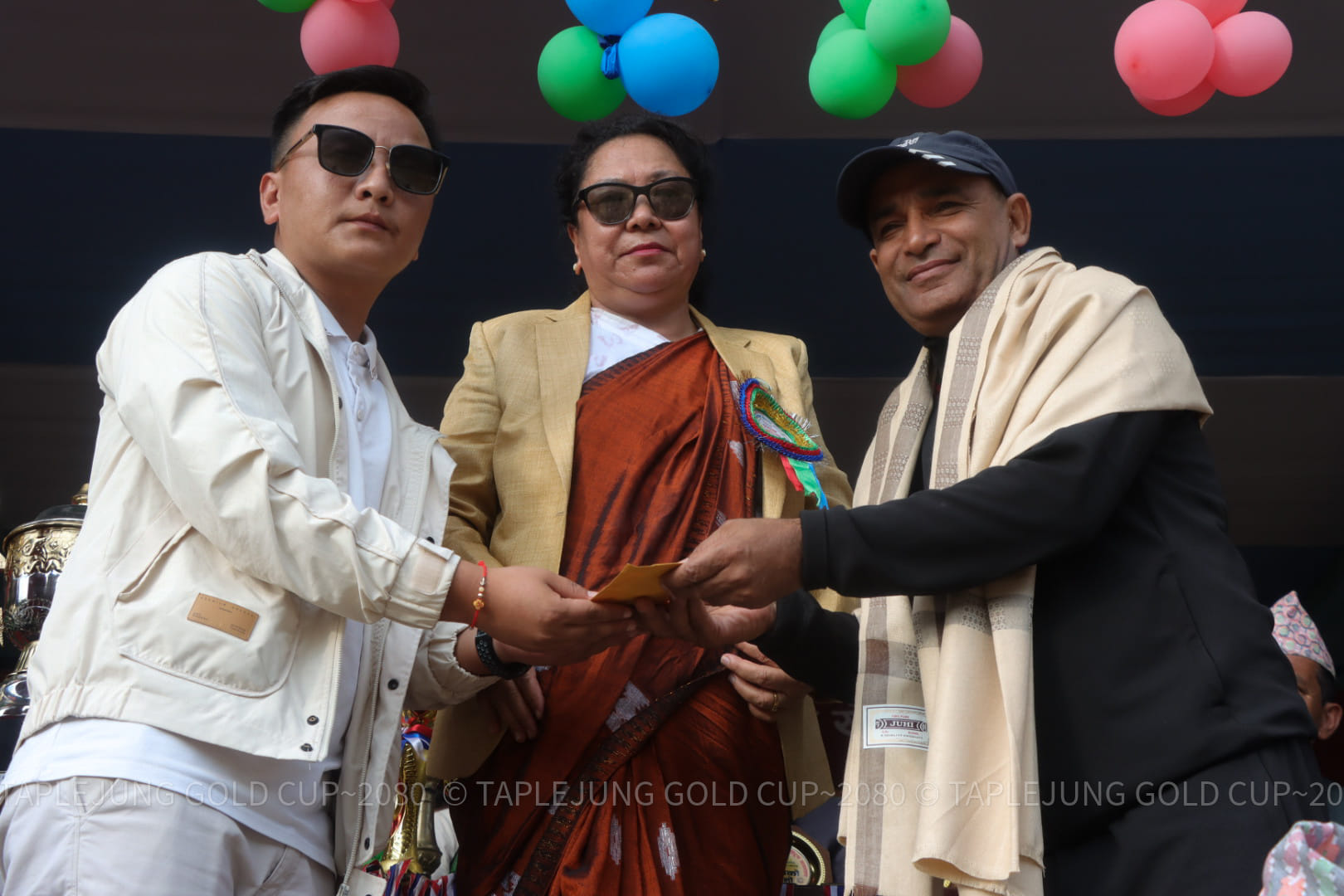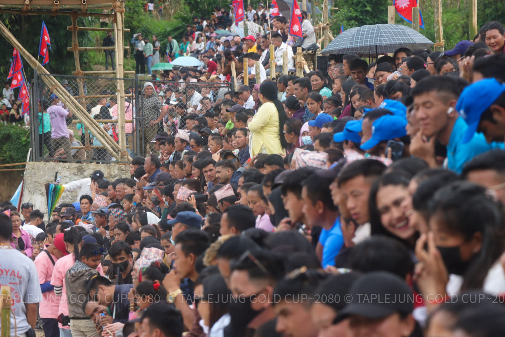 यता आर्थिक सहयोग जुटाउन भदौ ६ गते खोलिएको लक्ष्मी सनराईज बैंकस्थित खातामा न्यून रकम जम्मा भएको थियो । भदौ १० गतेसम्म हरेकको अनुहार मलिन थियो । तैपनी समितिका हरेकले भनिरहेका थिए,–फुटबल हुन्छ । अपवाद स्वरुप केहीले भन्थे,‘फुटबल त हिलोमा गर्ने नै भए । जिल्लाकै वेइज्जत हुने भयो ।’ तर नेतृत्व र समितिप्रति सिंगो समाज सकारात्मक थियो । नगद सहयोग गर्नेको विवरण क्षण–क्षणमा ताप्लेजुङ गोल्डकप पेजमा आउँथ्यो । बैङमा पैसा जम्मा नभएपनि खोजी–खोजी गएर आयोजकलाई नगद नै बुझाएको फोटोले आर्थिक समस्या छैन भन्ने झल्को दिन्थ्यो । फुङलिङ नगरपालिका नगरप्रमूख अमिर मादेनले ५ लाख रुपैयाँ कार्यपालिका बैठकबाट निर्णय गराएर दिने बचनले समितिलाई ठूलो ढाडस मिल्यो । आठराई त्रिवेणी गाउँपालिका अध्यक्ष दीपेन पोमू र मैवाखोला गाउँपालिका अध्यक्ष विजयप्रकाश वनेमले सामाजिक संञ्जालमै बधाई दिएर खेल आयोजना गर्न प्रेरित गर्यो । फुटबललाई नजिकबाट नियालेका एमालेका उपसचिव मणि पोमूदेखि प्रदेश सांसद खगेनसिंह हाङगाम, अग्रज खेलाडीहरु अम्बर श्रेष्ठ,अनन्त भट्टराई,यादब श्रेष्ठ र भलिबल पिता तेजप्रता सुब्बा र कृष्ण चोङवाङले समेत समितिलाई विश्वास गर्यो । असल नियतले सुरुवात भएको कामको अन्त्य पनि असल परिणामसहित हुन्छ भन्ने भावना बोकेकाको मनोबल बढ्नेगरि भदौ ११ गतेदेखि मौसमले पनि साथ दियो । अझ भनौ,प्रकती अनुकुल बन्न थाल्यो । भदौ ११,१२ र १३ गतेको दिनलाई आयोजकले साँच्चिकै खेल गर्न लायक मैदान बनाएरै छाडे । अध्यक्ष गुरुङले भने,‘हामीले भोक भनेनौ । न त झरि नै भन्यौ । न त निन्द्रा नै । न त तनाव । एकहोरो फुटबल मात्र भन्यौ ।’ कतिपयले त मैदानको दृश्यलाई टिक टकमा समावेश गरे । भदौ १३ गते मैदानमै पत्रकार सम्मेलन गरे । पत्रकार सम्मेलनमा गुरुङले भने,‘यो ताप्लेजुङ हो । यहाँ एकता छ । फुटबल क्रेज छ । फुटबल गर्ने तागत छ ।’ उनले भनेझै त्यो लोभलाग्दो एकता देखियो । त्यति मात्र कहाँ हो र ? पत्यारिलो नेतृत्वसहितको टिम र स्प्रष्ट भिजन भए जुनसुकै काम असम्भव छैन भन्ने पुष्टि गरिदियो । पाँचथरका अफिसियल तथा खेलाडीका अनुसार यो वर्षको मैदान २०४९ सालयताकै राम्रो हो । काबेली र गुप्तेदेखि ल्याएको डस र बालुवाले बनेको मैदान साँच्चिकै खेल्न लायक बन्यो । भुँईमा लडेर कुनै पनि खेलाडीले चोट बोक्नु परेन् । कोशी प्रदेश फुटबल सँघका महासचिव भगिरथ आले (मामा) का अनुसार यस पटक आयोजकले गज्जबै गर्यो । आलेले भने,‘भदौ १० गतेसम्म सामाजिक संञ्जालमा फोटो हेरेर नर्मश नै थिए । तर ११ र १२ गतेको कामले कहिले ताप्लेजुङ पुगौ भन्ने लाग्थ्यो ।’ फुटबल बुझेको मान्छेले नेतृत्व गर्दाको नतिजा कति फरक हुन्छ भन्ने सावित गर्यो । स्टेजमा प्रतिनिधिसभा सदस्य डा.तोषीम