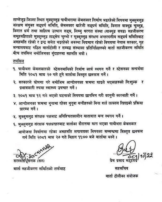 हिजो र आज भएको वार्तापछि दुई पक्षबीच ६ बुँदे सहमति भएको हो । सहमति अनुसार पाथीभरा केबलकारको स्टेसनमाथिको निर्माण कार्य हाललाई स्थगन हुनेछ । स्टेसनका सन्दर्भमा आउँदो २७ माघमा हुने वार्तामा विस्तृत छलफल हुनेछ ।