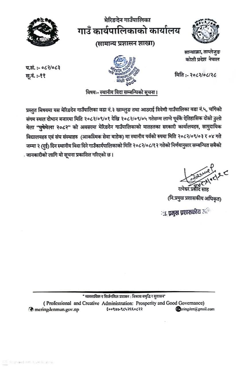 ताप्लेजुङ । पाँच दशकभन्दा बढी समयदेखि निरन्तर लाग्दै आएको ऐतिहासिक पुसे मेलाका अवसरमा ताप्लेजुङको मेरिङदेन गाउँपालिकाले दुई दिन स्थानीय बिदा दिएको छ। गाउँ कार्यपालिकाको निर्णयअनुसार पुस ३ र ४ गते गाउँपालिकाभित्र आकस्मिक सेवा बाहेक सबै सरकारी कार्यालय, सामुदायिक विद्यालय तथा संघ–संस्थाहरू बन्द रहने भएका छन्।