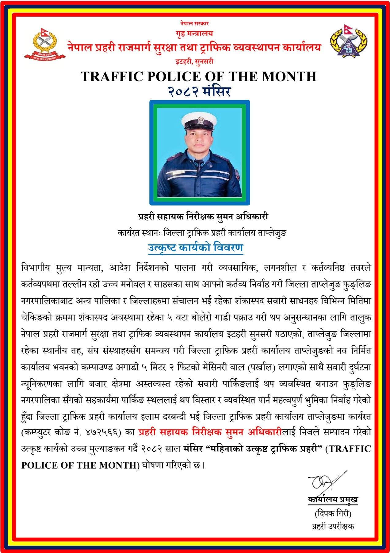 उत्कृष्ट कार्यसम्पादनको उच्च कदर गर्दै प्रहरी सहायक निरीक्षक सुमन अधिकारीलाई २०८२ साल मंसिर महिनाको ‘महिनाको उत्कृष्ट ट्राफिक प्रहरी’ घोषणा गरिएको जिल्ला ट्राफिक प्रहरी कार्यालयले जनाएको छ।