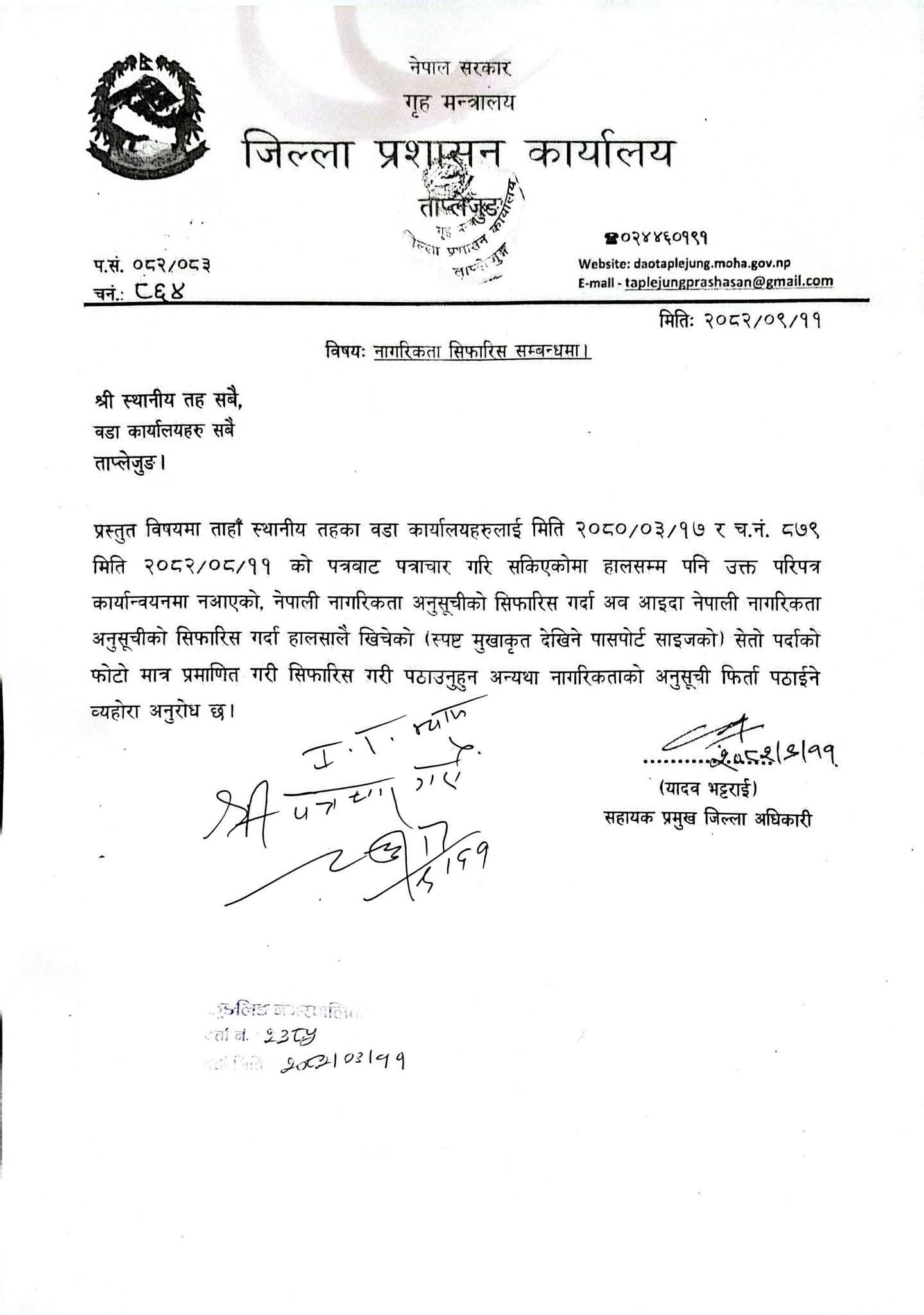 ताप्लेजुङ, पुस ११ । जिल्ला प्रशासन कार्यालय ताप्लेजुङले नागरिकता सिफारिस प्रक्रियामा प्रयोग हुने फोटोबारे कडाइ गर्ने निर्णय गरेको छ।