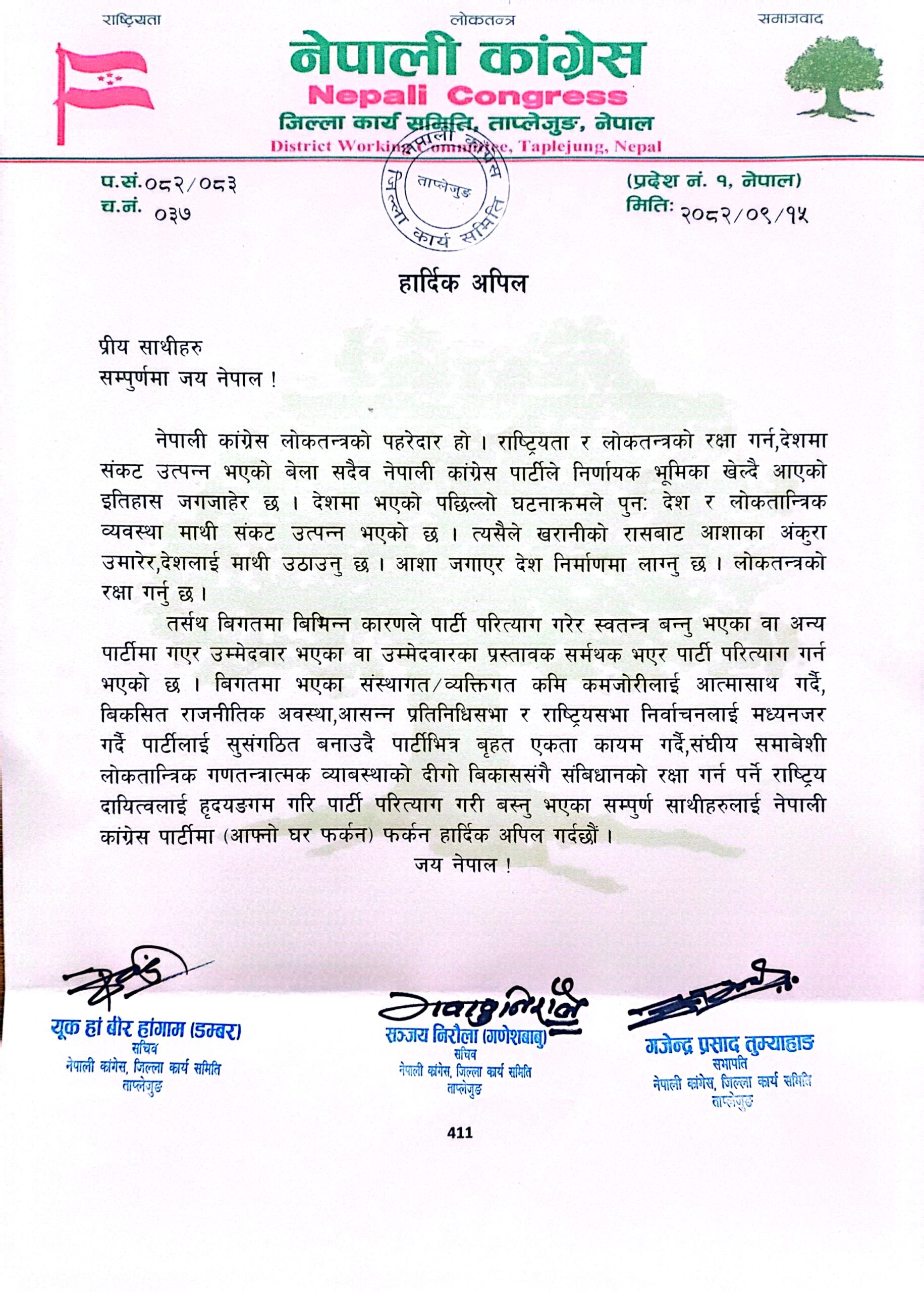 उक्त अपिलमा जिल्ला सभापति गजेन्द्र प्रसाद तुम्याहाङ, सचिव युगवीर हाङबाङ (डम्बर) र सह–सचिव सञ्जय निरौलाले हस्ताक्षर गरेका छन्।