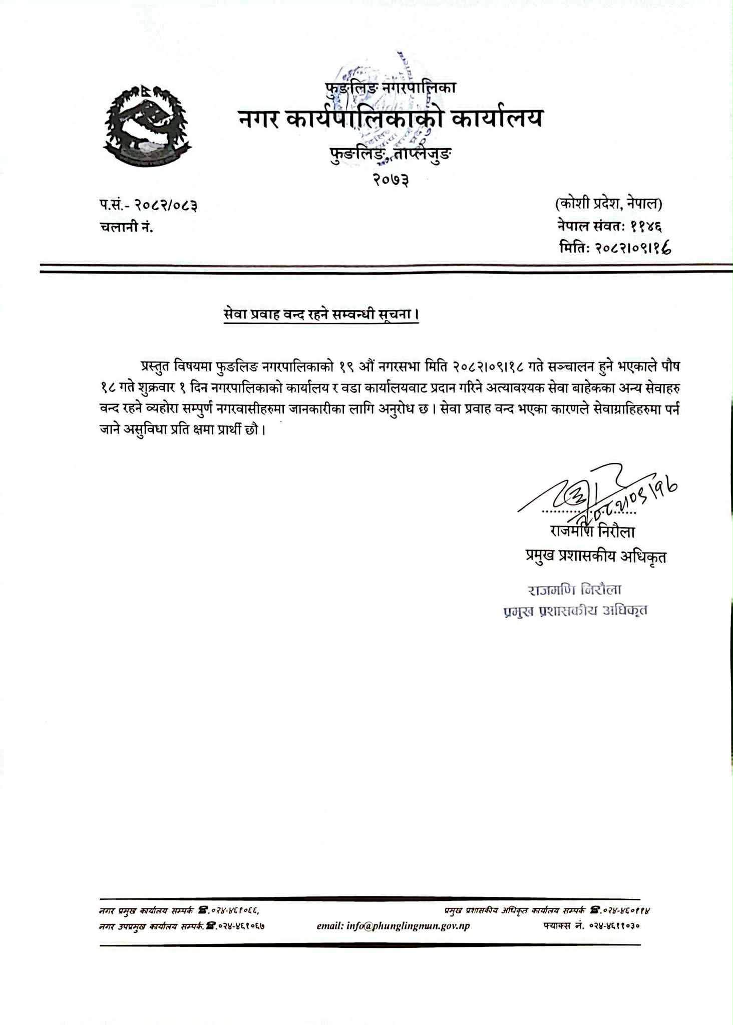 नगर कार्यपालिकाको कार्यालय फुङलिङ, ताप्लेजुङले जारी गरेको सूचनाअनुसार मिति २०८२ साल पौष १८ गते शुक्रबार नगरसभा सञ्चालन हुने भएकाले सो दिन नगरपालिकाको केन्द्रीय कार्यालय तथा वडा कार्यालयहरूबाट प्रदान गरिँदै आएका अत्यावश्यक सेवाबाहेकका अन्य सबै सेवा बन्द रहने जनाइएको छ।
