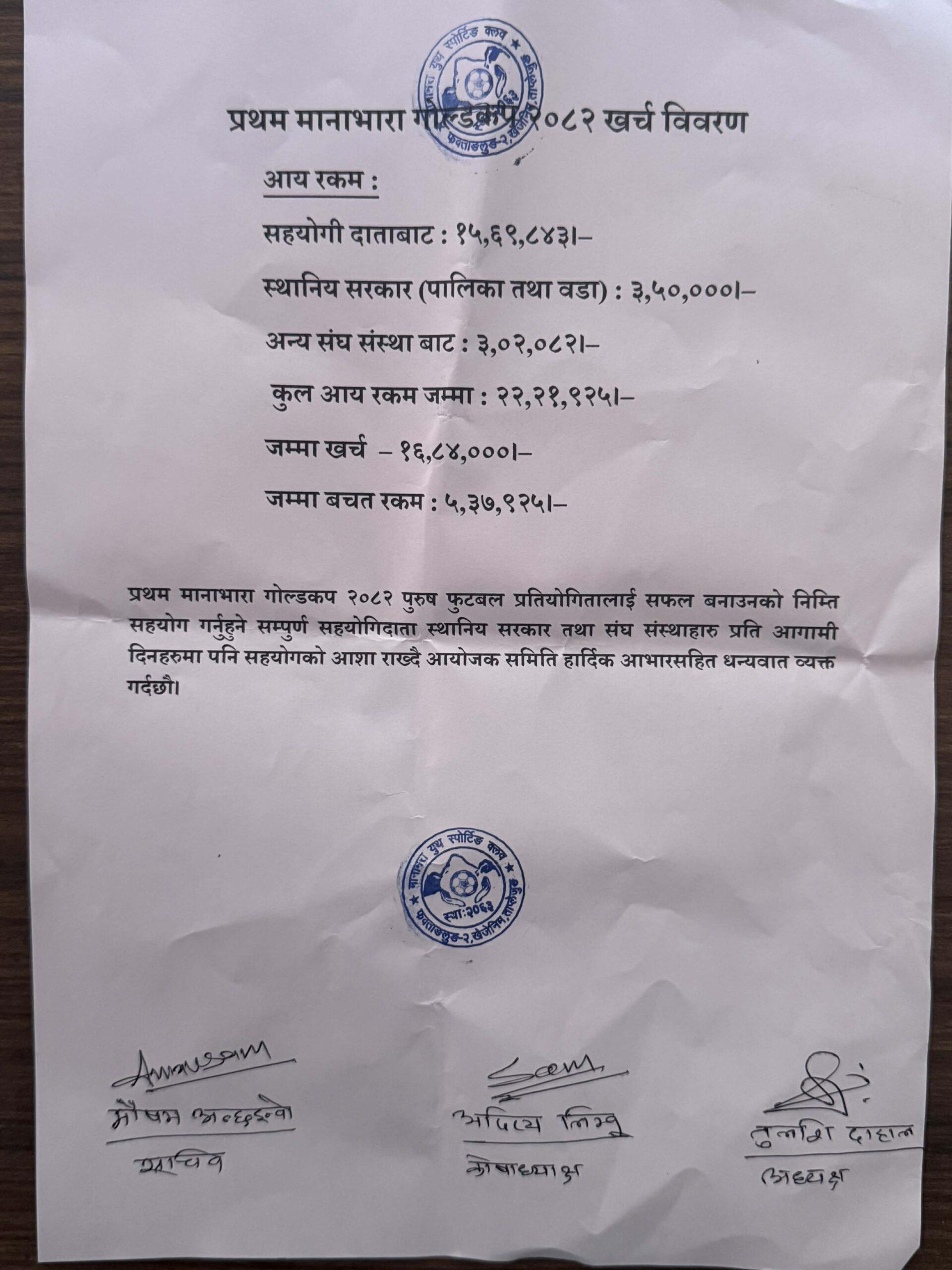 समितिले आय–व्यय पारदर्शी रूपमा सार्वजनिक गर्दै प्रतियोगिता सफल बनाउन सहयोग गर्ने स्थानीय सरकार, संघ–संस्था, सहयोगी दाता तथा प्रत्यक्ष–अप्रत्यक्ष रूपमा साथ दिने सबैप्रति धन्यवाद व्यक्त गरेको छ।