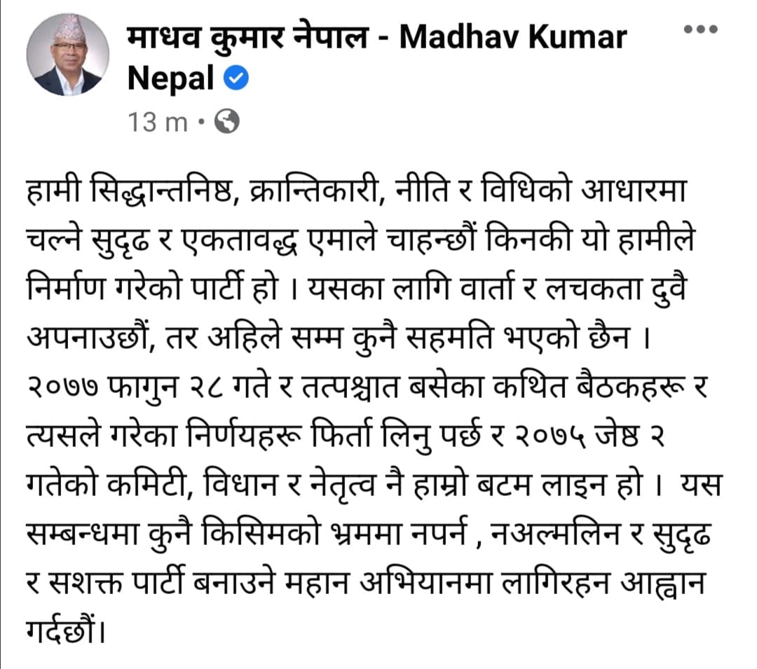 शुक्रबार सामाजिक सञ्जालमार्फत नेता नेपालले आफुहरु सिद्धानतनिष्ठ क्रान्तिकारी, नीति र विधिको आधारमा एकताबद्ध एमाले चाहाने भन्दै त्यसका लागि वार्ता र लचकता अपनाउने तर अहिलेसम्म कुनै सहमति नभएको बताएका हुन् ।