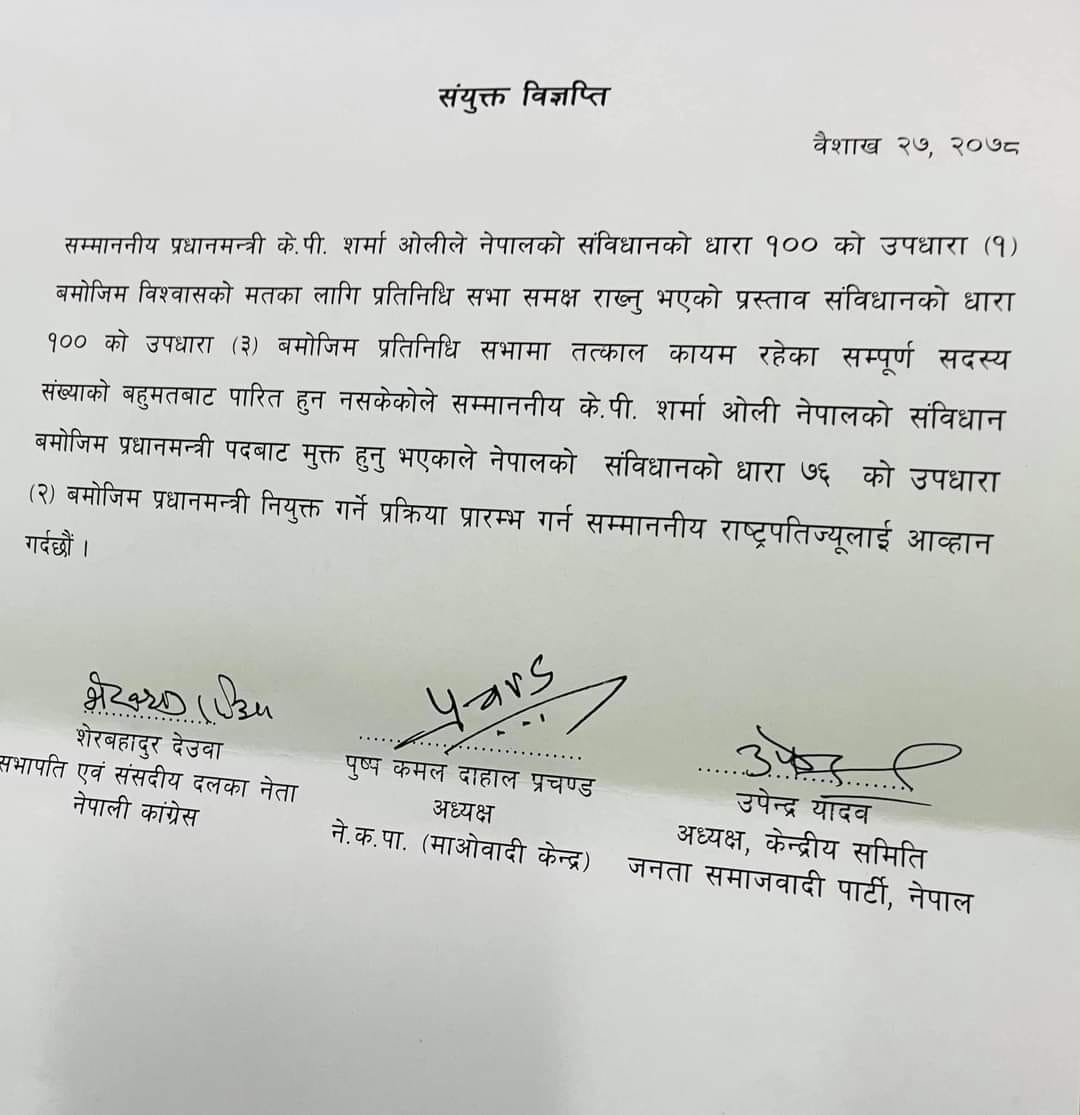 विश्वासको मतको प्रस्ताव अस्वीकृत भएको अवस्थामा काँग्रेस, माओवादी केन्द्र र जसपाका अध्यक्षले संयुक्त विज्ञप्ति जारी गरी राष्ट्रपतिलाई यस्तो प्रक्रिया थाल्न सुझाव दिएका छन् । काँग्रेस सभापति शेरबहादुर देउवा, माओवादी केन्द्रका अध्यक्ष पुष्पकमल दाहाल प्रचण्ड र जसपा अध्यक्ष उपेन्द्र यादवद्वारा हस्ताक्षरित संयुक्त विज्ञप्तिमा जारी गरेर नयाँ सरकार गठनको प्रक्रिया अघि बढाउन भनेका छन् ।