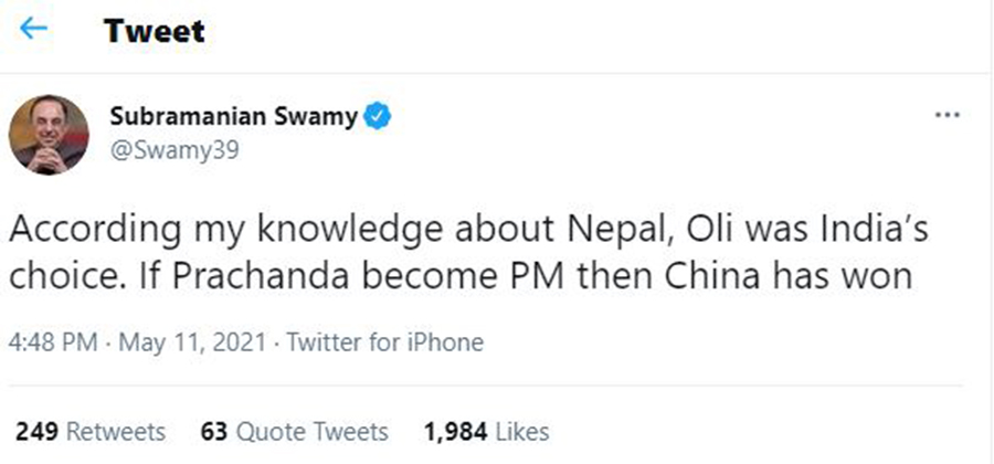 नेपालमा नयाँ सरकार गठनका लागि प्रयास भइरहेका बेला भाजपा नेताले यस्तो बताएका हुन् । पूर्वमन्त्रीसमेत रहेका स्वामीले माओवादी केन्द्रका अध्यक्ष पुष्पकमल दाहाल प्रचण्ड प्रधानमन्त्री भएमा चीनले जित्ने दाबीसमेत गरेका छन् ।