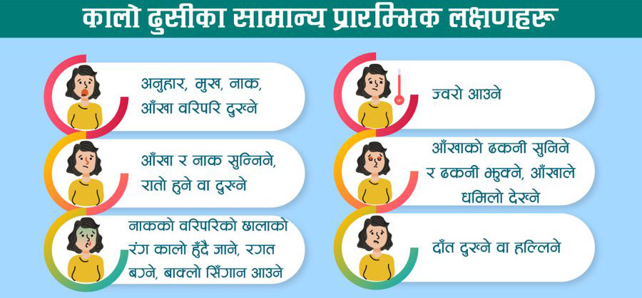 ब्ल्याक फङ्गस शरीरको जुन हिस्सामा संक्रमण हुन सक्छ । संक्रमणको आधारमा लक्षण देखिने गर्छ । जस्तै ज्वरो आउने, टाउको दुख्ने, नाक बन्द हुने, बान्ता तथा उल्टी आउने, छाती दुख्ने, अनुहारको एकपट्टिको भाग फुलिने, नाकमा कालोकालो घाउ देखिने हुन्छ । सामान्यतया कोरोना संक्रमणको लक्षण देखिएको २ देखि ४ हप्तासम्म कालो ढुसीको समस्या देखिन्छ । कोलो ढुसीको संक्रमण भएको १० देखि ६० दिनसम्म पनि समस्या देखिरहन सक्ने वरिष्ठ रोग विषेशज्ञ डा. बम बताउँछन् ।